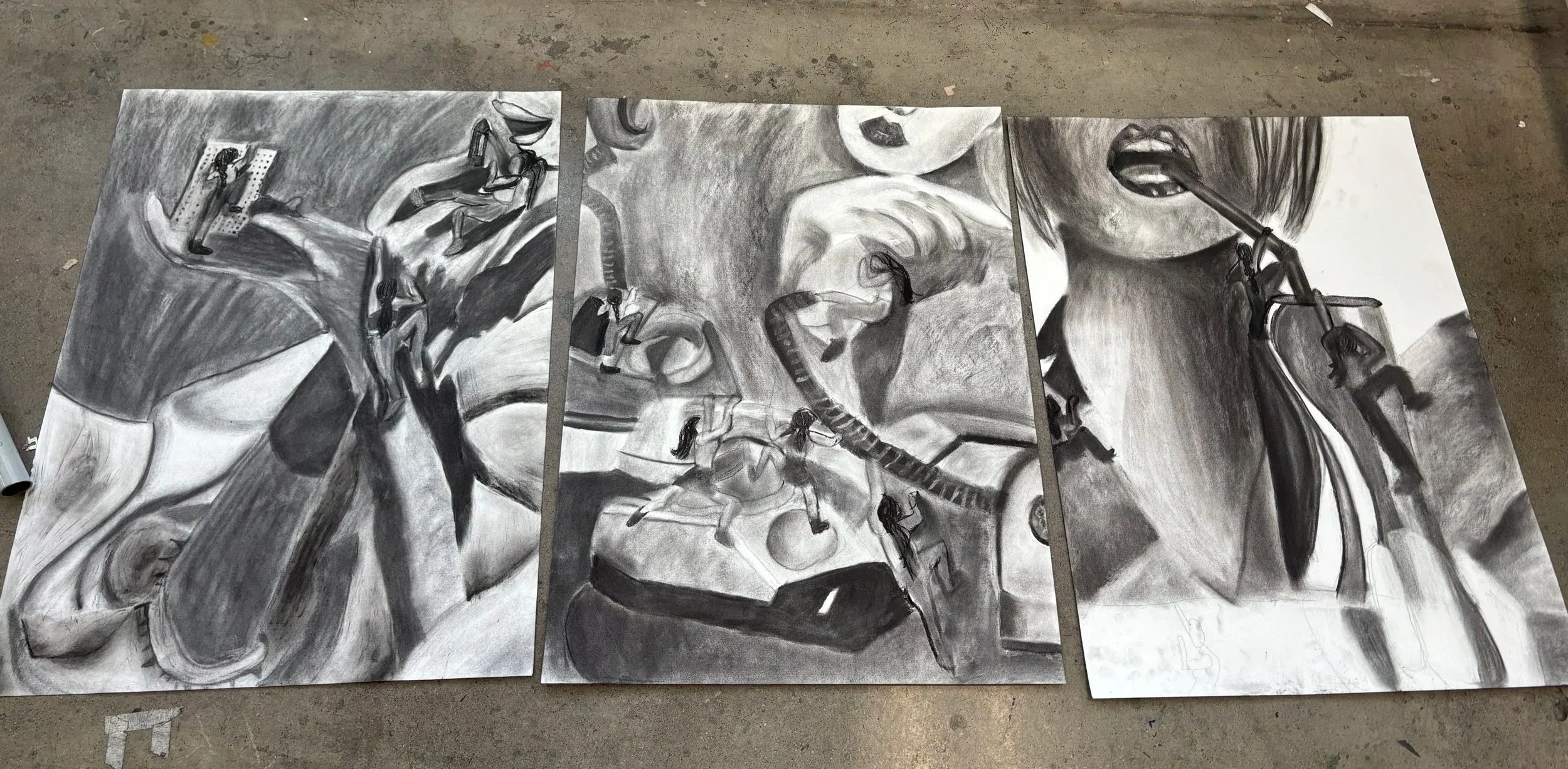 In this series of charcoal drawings called Women’s Climb, I depicted miniature women climbing these large scale sex symbols of women to show the interaction between being a women and media’s ideals about women.